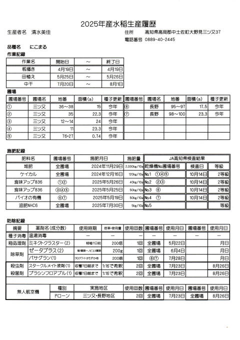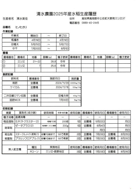特別栽培米の産地・品種・年産表示の根拠資料として2024年産米から水稲生産履歴を閲覧頂けるようにしました。
