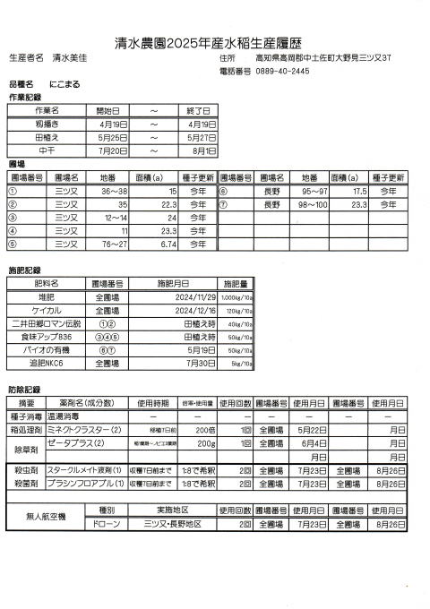 清水園 米の生産履歴